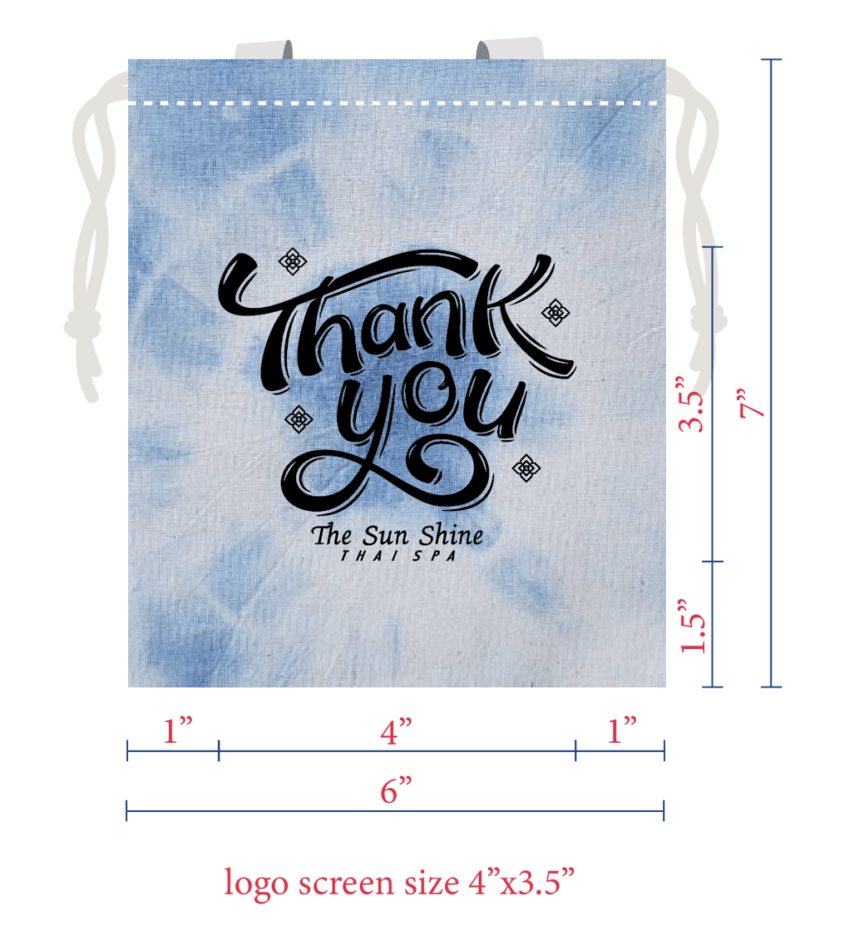 ภาพตัวอย่างสินค้า : ขนาด 6×7 นิ้ว หูรูด หูหิ้ว ผ้ามัดย้อมคละสี พร้อมสกรีนโลโก้ ที่ออกแบบโดยทางร้าน